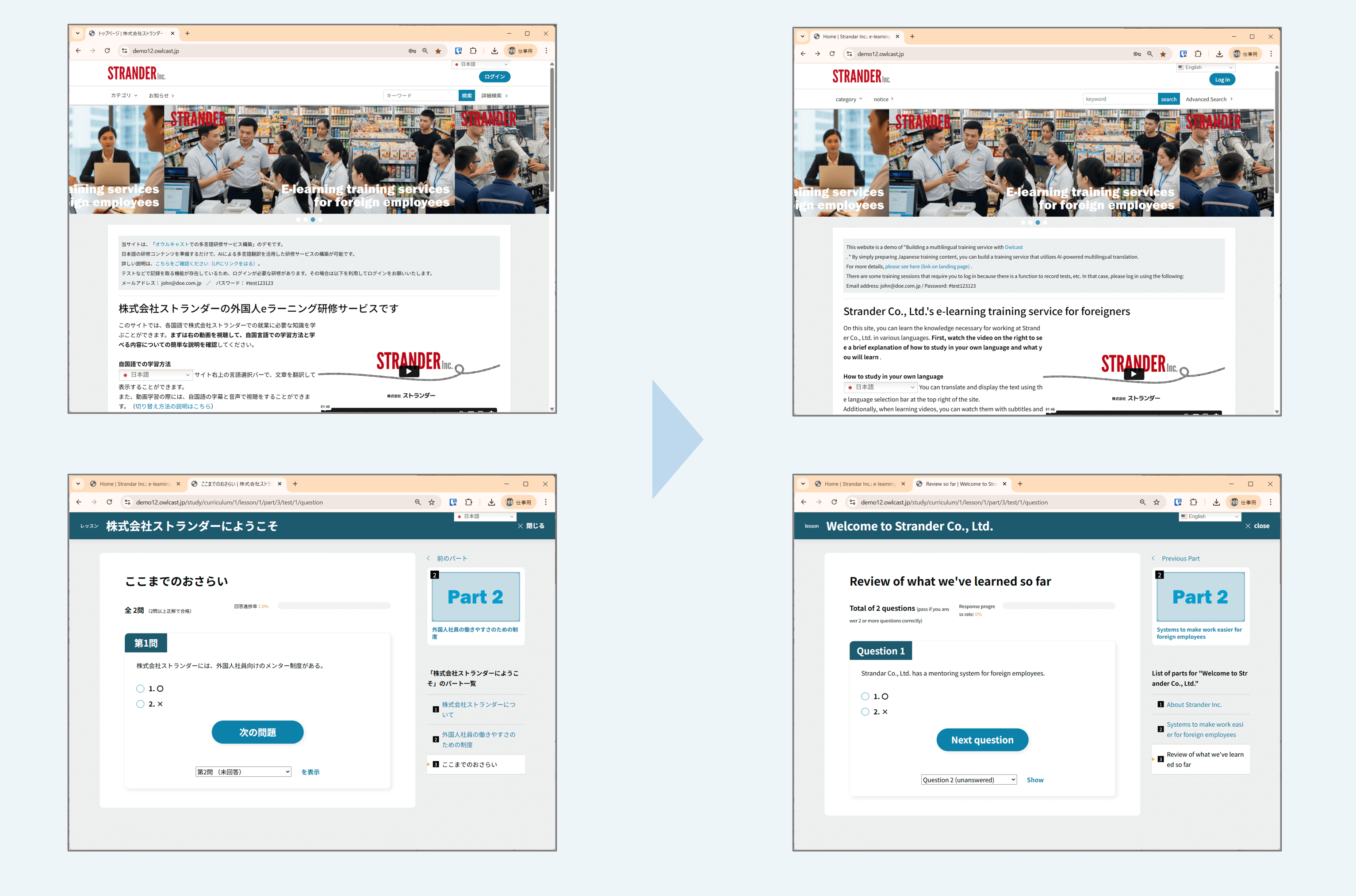 オウルキャストの受講画面。テスト問題も含め、受講サイト全体の翻訳が可能です。