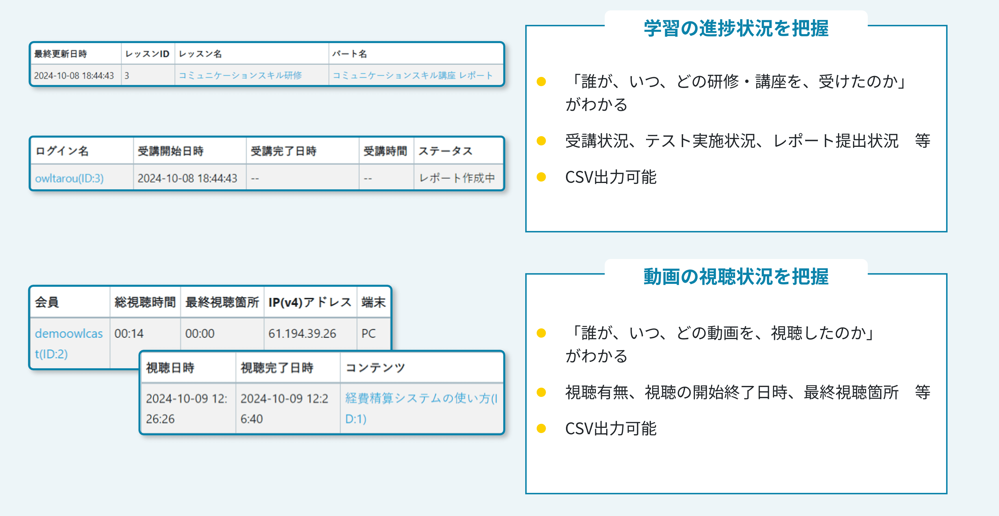 オウルキャストは学習の進捗状況や、動画の視聴履歴を詳細に確認できます。